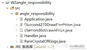 具体而言,我们首先通过一个接口实现接收用户提交的请求,再通过三个类的实例实现具体的处理请求操作;其中,通过类“60钻石/积分抽一次”实现在14种奖品中随机得到一个奖品、类“270钻石/积分抽五次”实现在14种奖品中随机得到五个奖品、类“幸运值达到一定数值之后”实现获得稀有水晶的奖励。