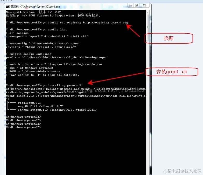 以管理员身份打开一个命令行窗口, 运行 npminstall –g grunt-cli, 直到系统提示安装成功。