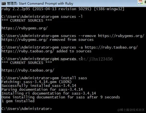 由于国内网络原因(你懂的),导致 rubygems.org 存放在 Amazon S3 上面的资源文件间歇性连接失败。这时候我们可以通过gem sources命令来配置源,先移除默认的https://rubygems.org源,然后添加淘宝的源https://ruby.taobao.org/,然后查看下当前使用的源是哪个,如果是淘宝的,则表示可以输入sass安装命令gem install sass了。