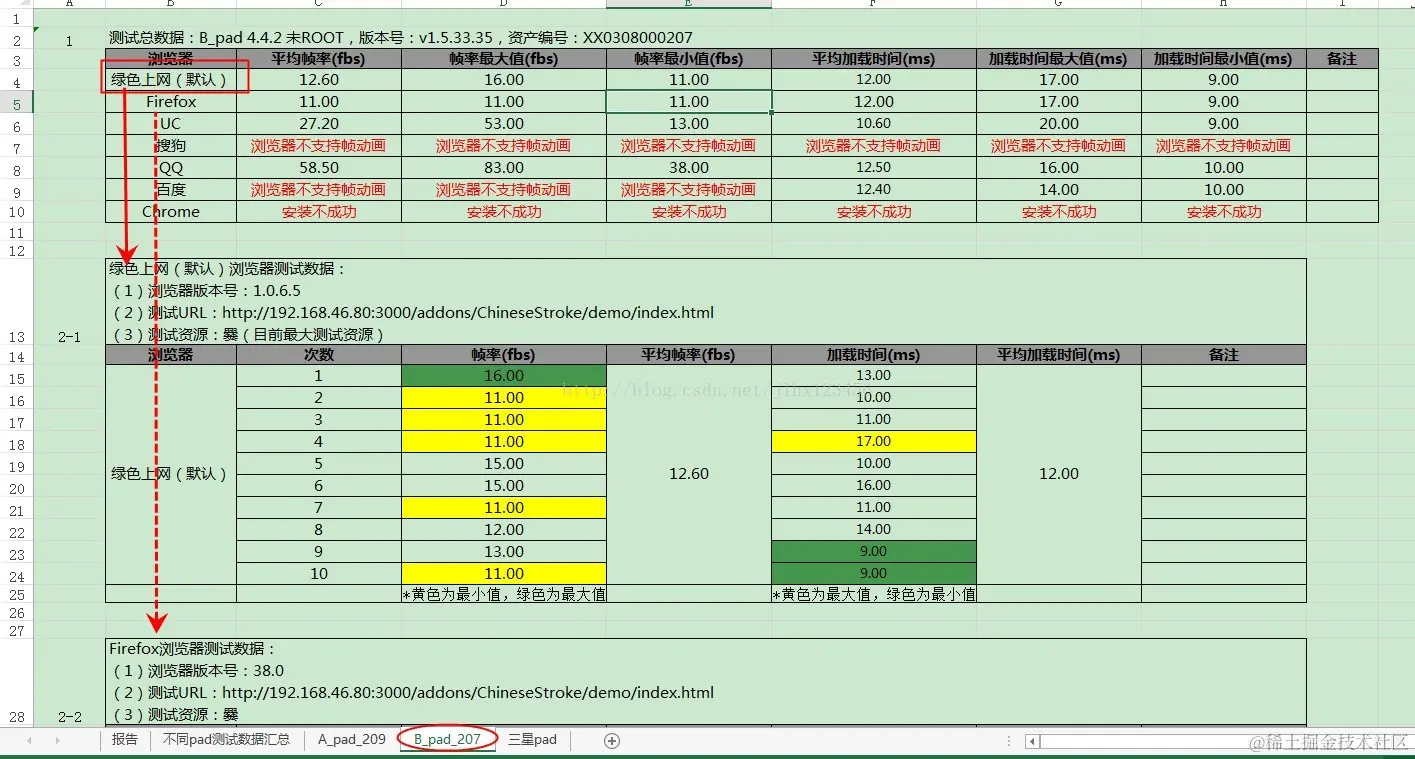(2)B_pad:需要记录ROM版本、资产编号、测试次数、每次执行的帧率和加载时间、平均加载时间、浏览器版本号、URL等,具体见下图: