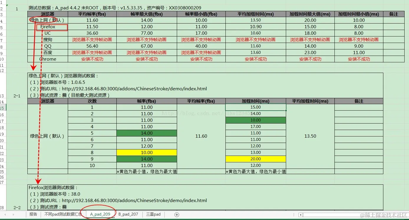 (1)A_pad:需要记录ROM版本、资产编号、测试次数、每次执行的帧率和加载时间、平均加载时间、浏览器版本号、URL等,具体见下图: