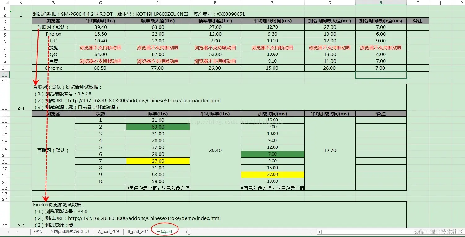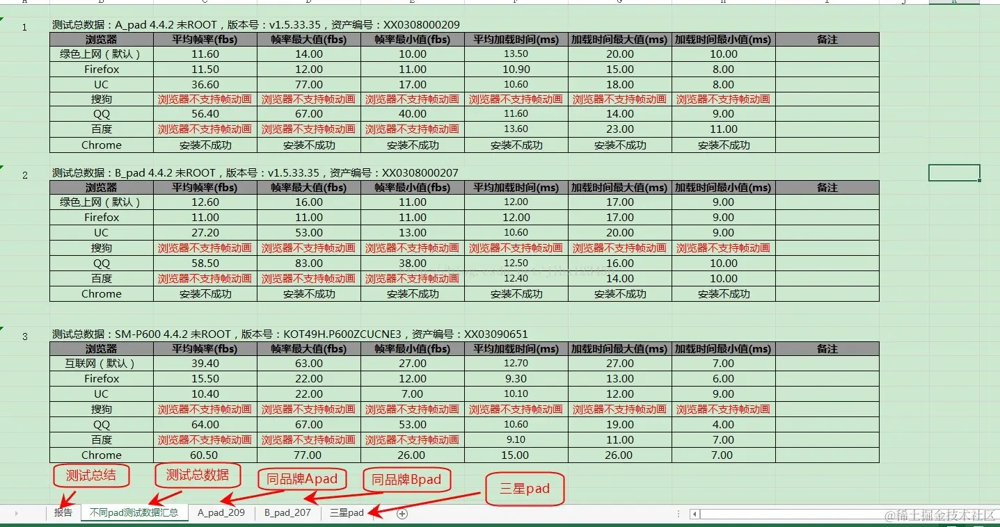 (3)三星pad:需要记录ROM版本、资产编号、测试次数、每次执行的帧率和加载时间、平均加载时间、浏览器版本号、URL等,具体见下图: