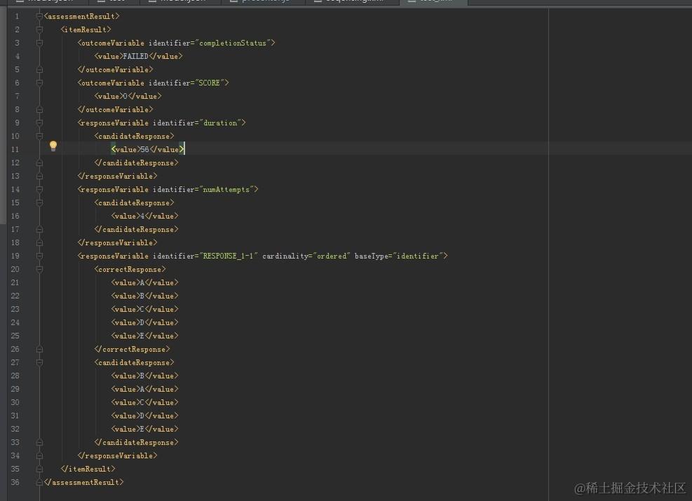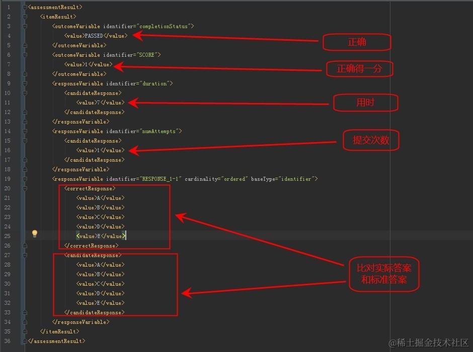 b.查找开发的答案配置文件,以及提交答案返回的数据配置文件格式,对答案对错、得分、用时、答题次数、提交答案、实际答案进行比对。