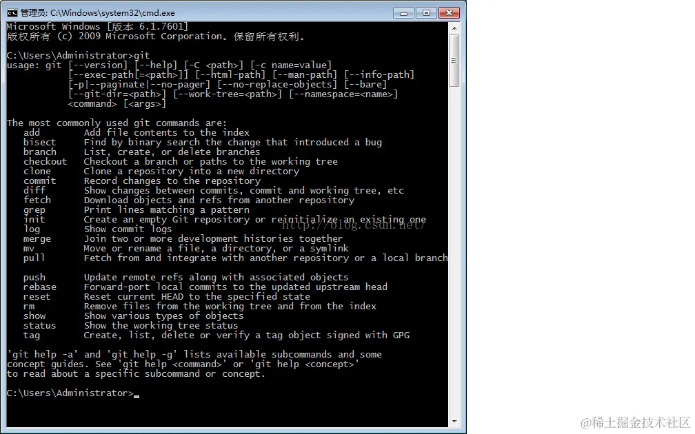 打开CMD,输入:git,如果出现一系列的语法说明,说明已经安装成功,见下图: