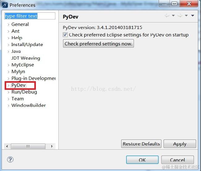 如何检查是否已经正确安装pydev?打开Eclipse–>Windows–>preferences,然后在左边的树状结构中就能找到Pydev选项。