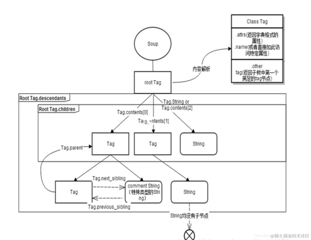 这四种类型的节点构成树,Soup代表这颗树,String为叶子节点,tag为标签子节点,为其标签包含的所有内容。