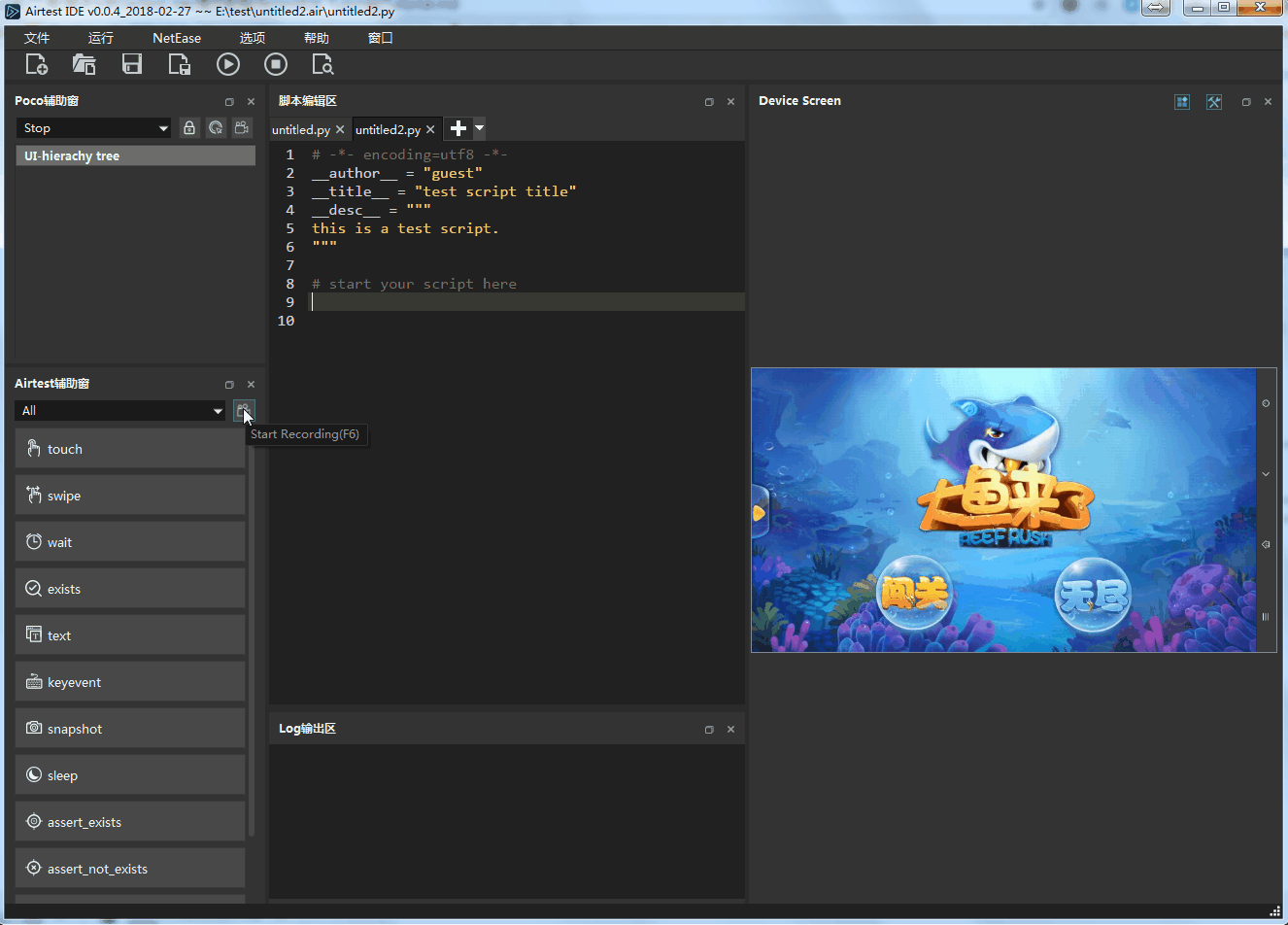 点击录制按钮,然后随着你的鼠标操作,会自动生成Poco语句到脚本编辑框中