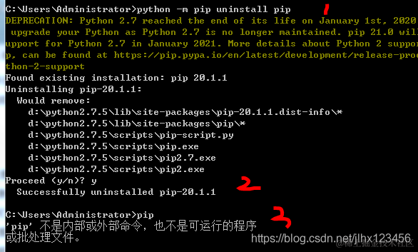 Windows下卸载pip的方法 BruceLan1024 2021-11-01 1,539 阅读1分钟 一、卸载命令 在cmd中输入 python -m pip uninstall pip 二、执行命令后,弹出确认提示,输入y,给与确认 三、cmd中输入pip,查看是否安装卸载成功
