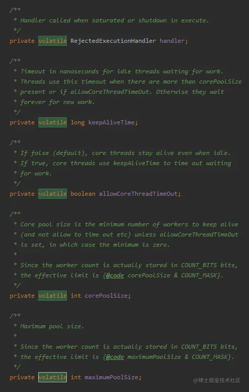 在线程池里面其他的很多字段都用到了 volatile: