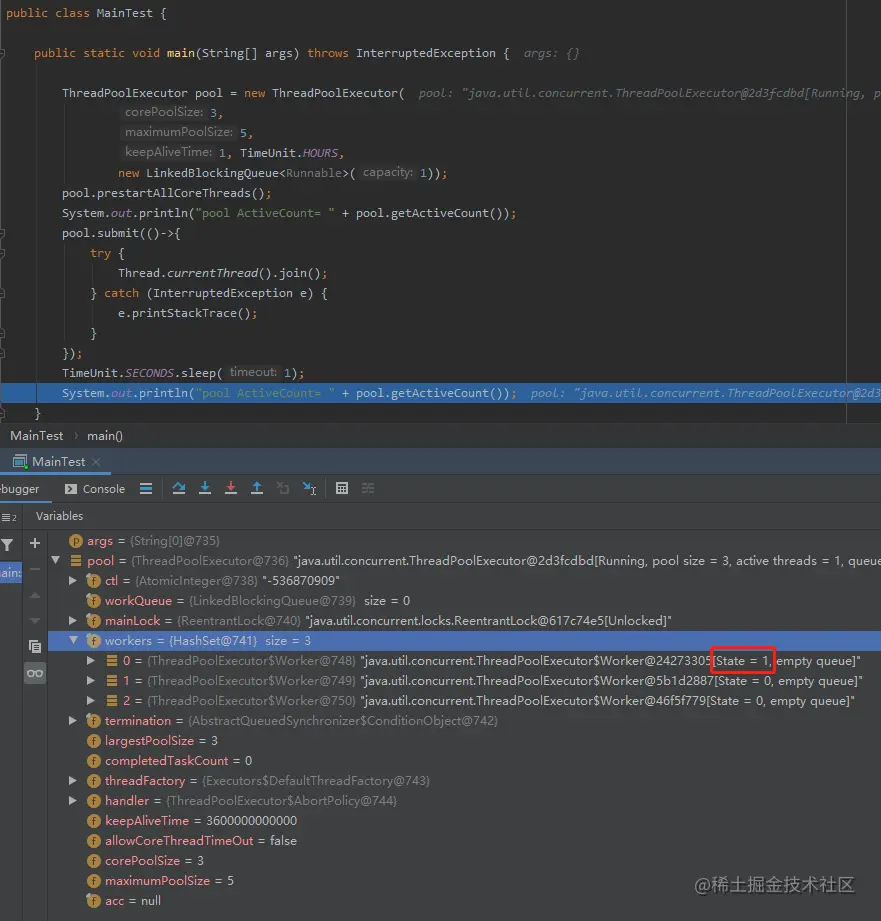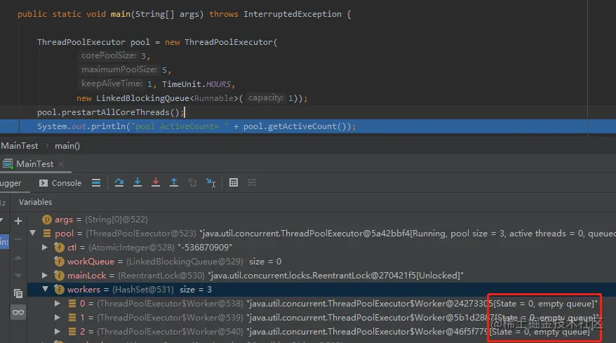 加上阻塞,程序是能感知到 largestPoolSize 有可能正在发生变化,所以获取到的一定是 addWorker 方法执行完成后的 largestPoolSize。