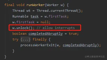 所以你去看 runWorker,你就知道为什么这里上来先进行一个 unLock 操作,后面跟着一个 allow interrupts 的注释: