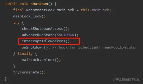 因为 shutdown 方法调用了 interruptIdleWorkers: