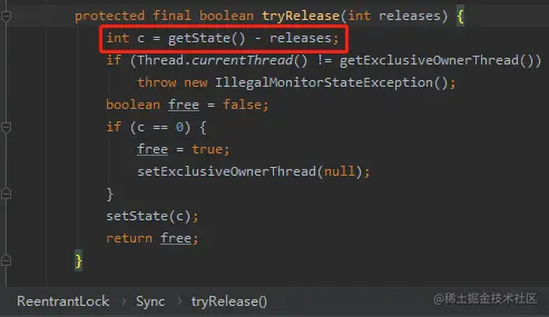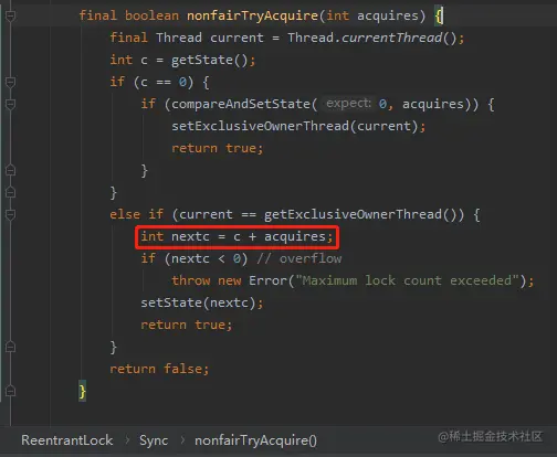 如果你还没反应过来是怎么回事的话,我给你看一下 ReentrantLock 里面的重入逻辑: