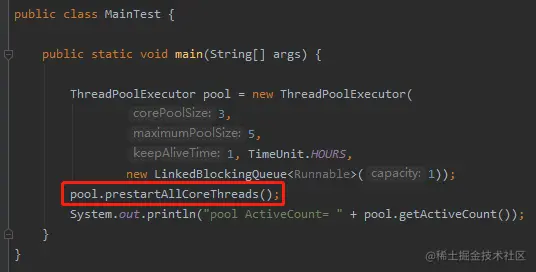 首先我们定义一个线程池,然后调用 prestartAllCoreThreads 方法把所有线程都预热起来,让它们处于等待接收任务的状态。