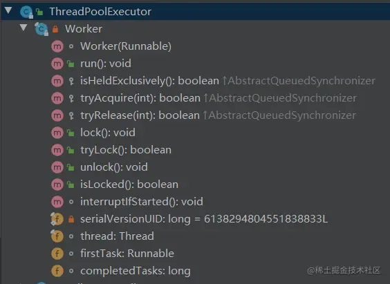 可以看到 Worker 是继承自 AQS 对象的,它的很多方法也是和锁相关的。