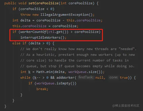 说明当前的 worker 的数量是多于我要重新设置的 corePoolSize,需要减少一点。