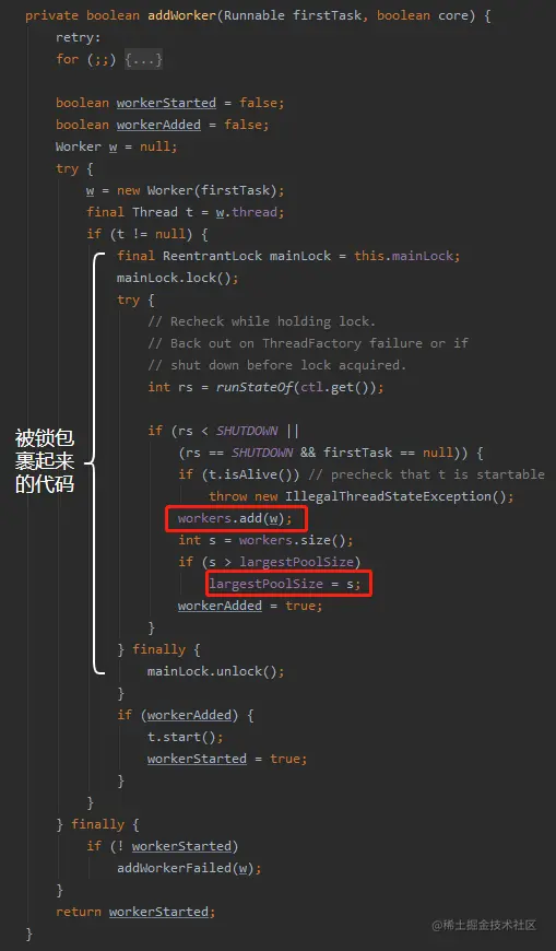 所以你就按照这个思路分析,addWorker 中被锁包裹起来的这段代码,它到底在独占什么东西?