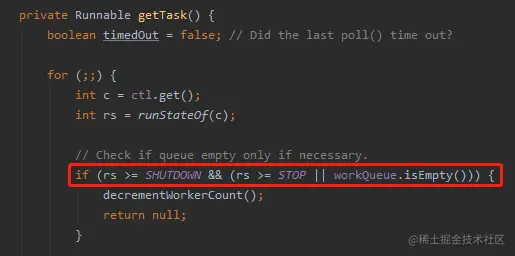 getTask 方法里面会先判断线程池状态,这个时候就能感知到线程池关闭了,返回 null,这个 worker 也就默默的退出了。