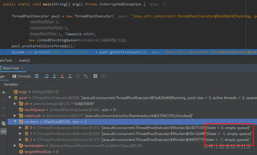 肯定是在启动过程中,执行了 workers.add 方法,但是还没有来得及执行 runWorker 方法的 worker 对象,它们的状态就是 -1。