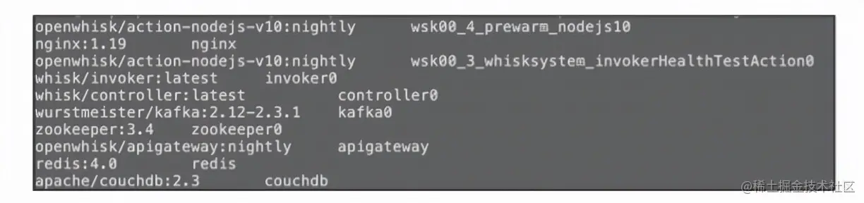 部署成功后,OpenWhisk 会在系统中启动几个 Docker 容器。我们可以通过 docker ps 来查看: