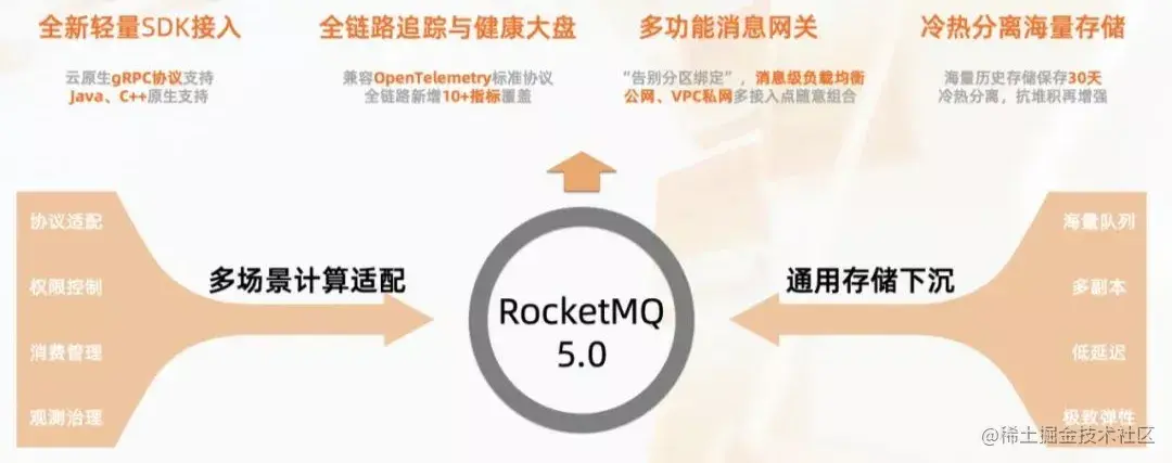 全新的 RocketMQ5.0 版将通用的存储逻辑下沉,集中解决消息存储的多副本、低延迟、海量队列分区等技术问题,将上层的消息处理和剥离出完全的无状态计算层,主要完成协议适配、权限管理、消费状态、可观测运维体系支持。得益于存算分离的架构设计,从 SDK 接入到线上运维全链路带来全面提升: