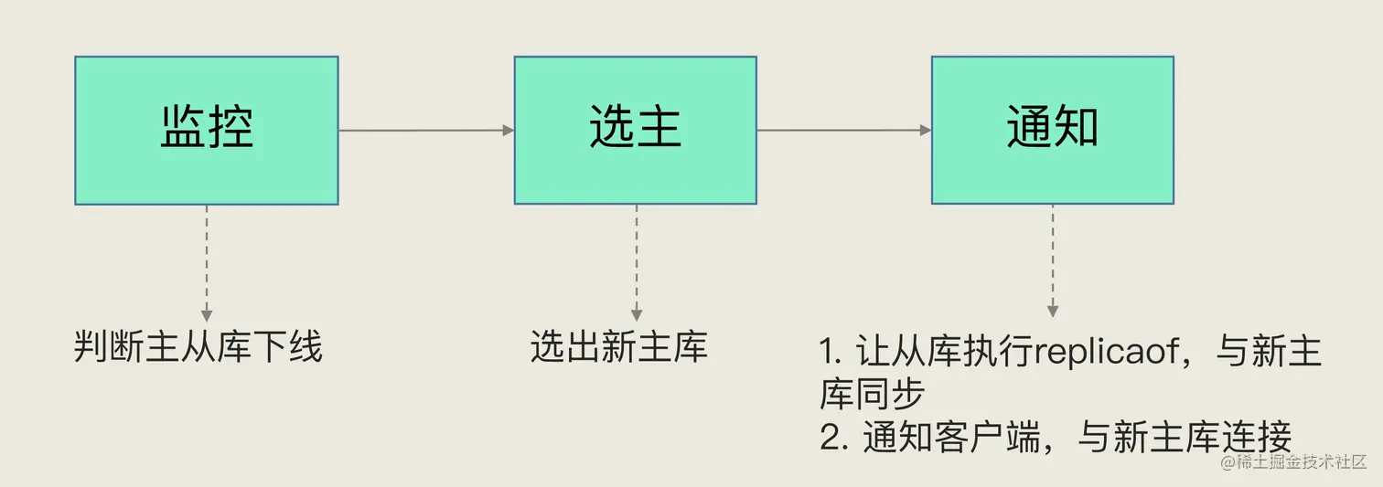 如果主库也没有在规定时间内响应哨兵的 PING 命令,哨兵就会判定主库下线,然后开始自动切换主库的流程\