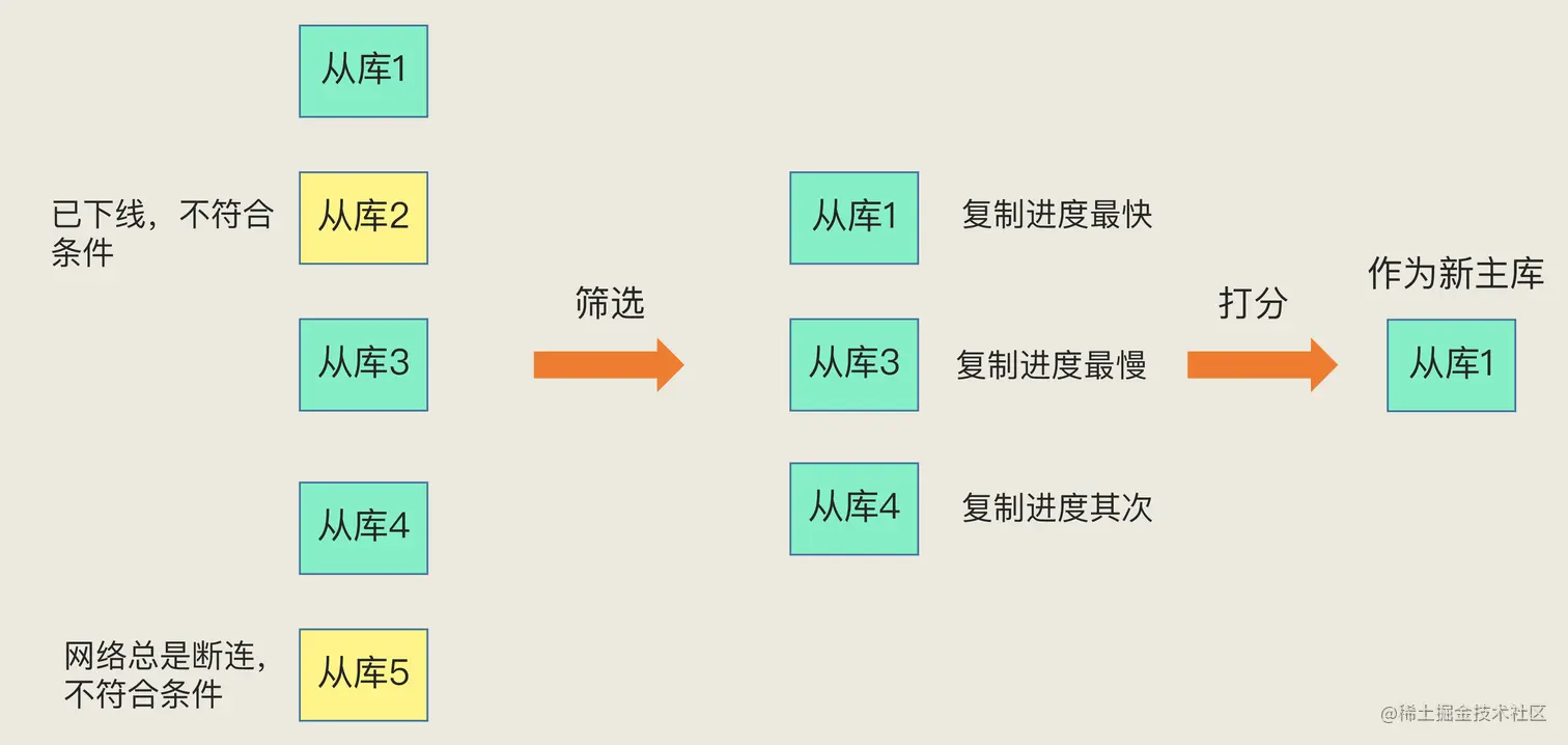 - 然后,依次按照优先级、复制进度、ID 号大小再对剩余的从库进行打分,只要有得分最高的从库出现,就把它选为新主库\