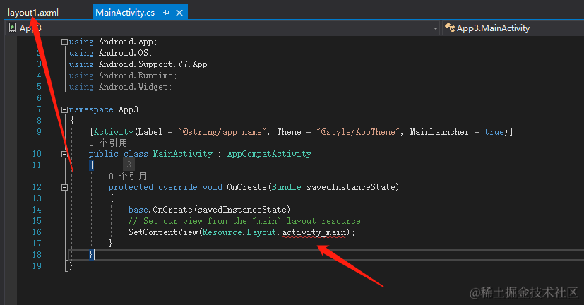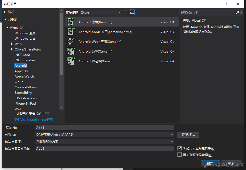 C#中创建Android项目 LcVong 2021-11-01 170 阅读1分钟 1.新建项目 2.选择安卓应用---空白程序 3.将上图布局文件删除重建(因为原有的布局不知道为啥不能放多个控件) 4。将报错的地方改成布局文件名。 ----------------------------------------------------------------------------------------------------------------------写程序