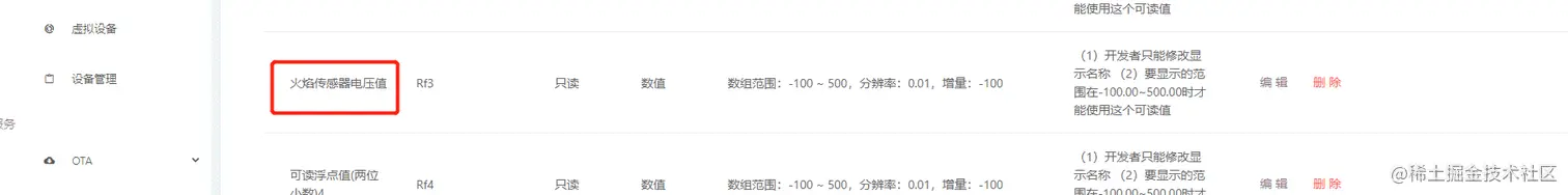 本例中我们使用了"Rf3"这个浮点型(带两位小数)的数据点作为向云端传输火焰传感器电压值的通道,记得在机智云平台修改相应的数据点的名称为“火焰传感器电压值”。