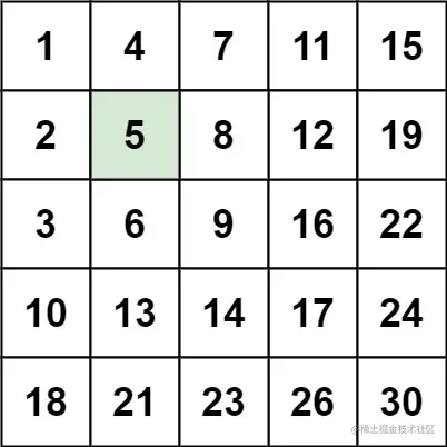 输入:matrix = [[1,4,7,11,15],[2,5,8,12,19],[3,6,9,16,22],[10,13,14,17,24],[18,21,23,26,30]], target = 20
