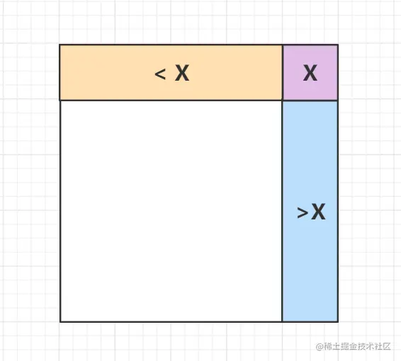 在m x n矩阵 matrix中我们可以发现一个性质:对于每个子矩阵右上角的数x,x左边的数都小于等于x,x下边的数都大于x。