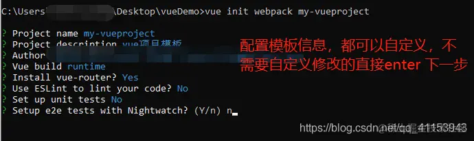 等待vue-cli安装成功之后,可以通过vue --version查看vue-cli有没有安装成功,如果安装成功了,cd+vueDemo的路径进入vueDemo文件夹内,输入命令vue init webpack my-vueproject,格式为vue init webpack +自定义的项目名称。