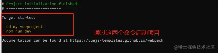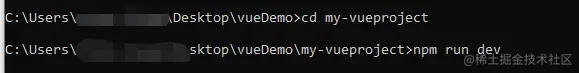 根据命令行界面提示的两个命令启动项目首先cd my-vueproject进行项目的文件夹下,然后npm run dev启动项目