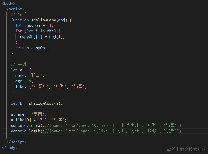 js 深拷贝和浅拷贝 pangka啊 2021-11-01 106 阅读1分钟 (1)浅拷贝 所谓浅拷贝,就是一个变量赋值给另一个变量,一个变量的值改变,则另一个变量的值也会发生改变。 (2)深拷贝 深拷贝就是,新拷贝的对象内部所有数据都是独立存在的,不会随着源对象的改变而改变 其中给b变量赋值的name,age属性属于深拷贝,而like属性则属于浅拷贝,a变量修改了like属性值,b变量也发生改变。