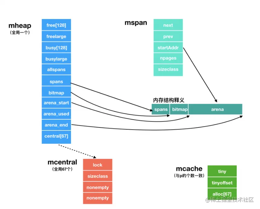 arena 即所谓的堆区,应用中需要的内存从这里分配,spans 和 bitmaps 是用来管理 arena 的。