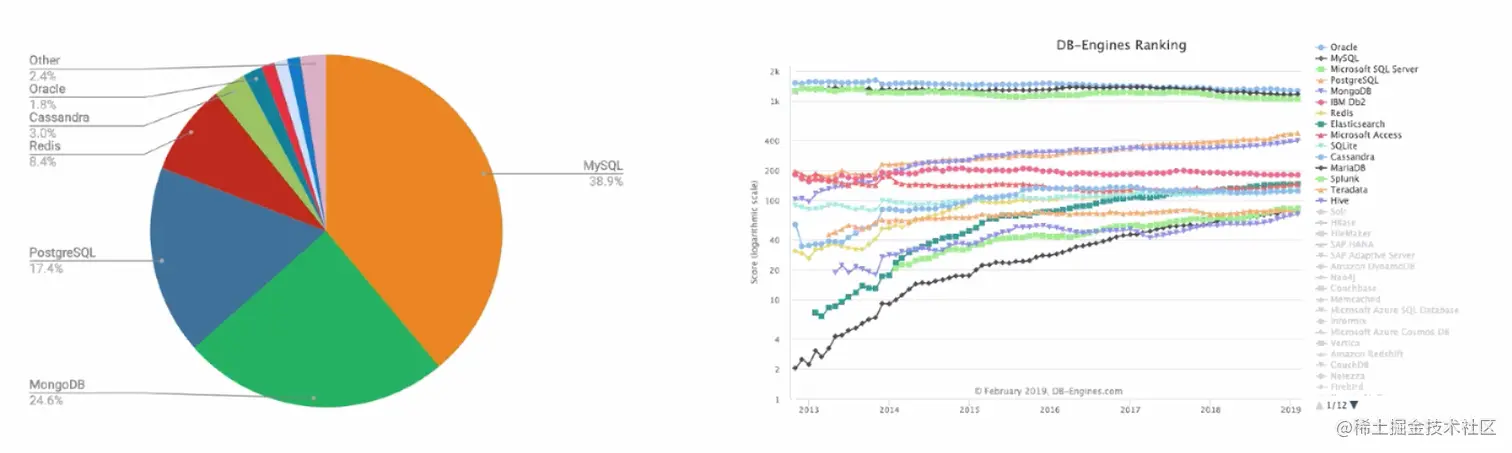 几十年来,关系型数据库一直领先于非关系型数据库,当前关系型数据库占据了大约 60% 的市场份额。在2019年统计的数据库使用率中,MySQL 高居榜首,同时,在数据库流行趋势报告中,MySQL 也位居前列。