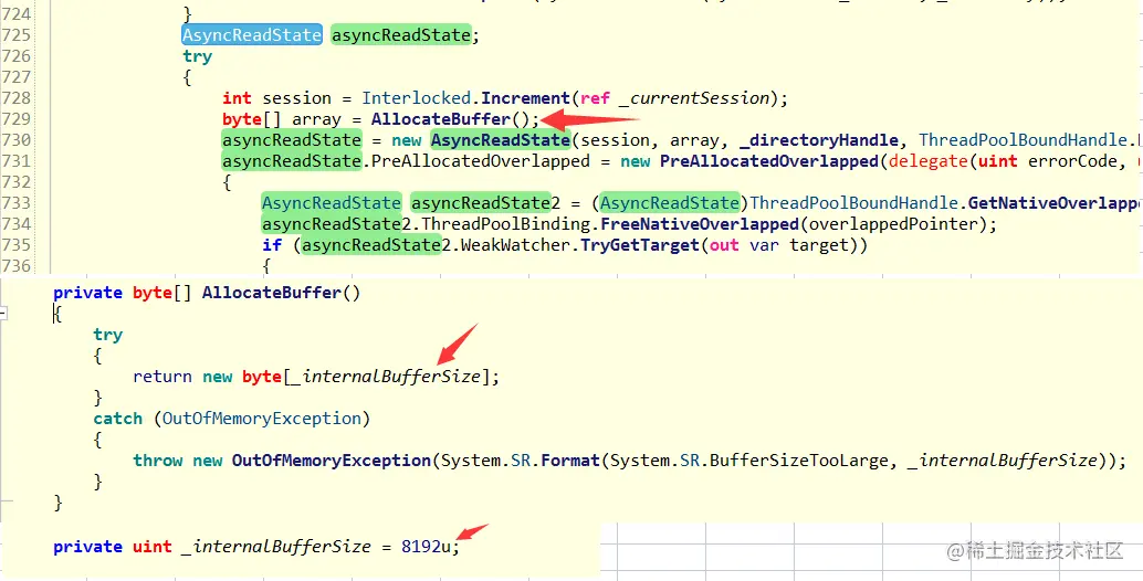 从输出中可以看到这些 byte[] 都是 async pinned,也就是当异步IO回来的时候需要给 byte[] 填充的存储空间,接下来我们看看如何通过 OverlappedData 找到源码中定义为 8192 大小的 byte[] 地方。