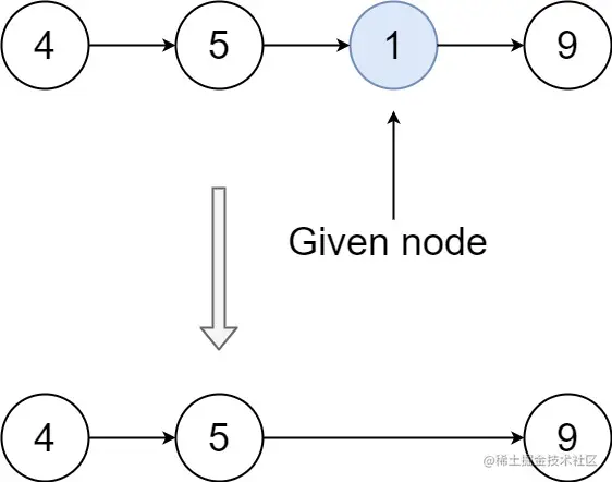解释:指定链表中值为 1 的第三个节点,那么在调用了你的函数之后,该链表应变为 4 -> 5 -> 9