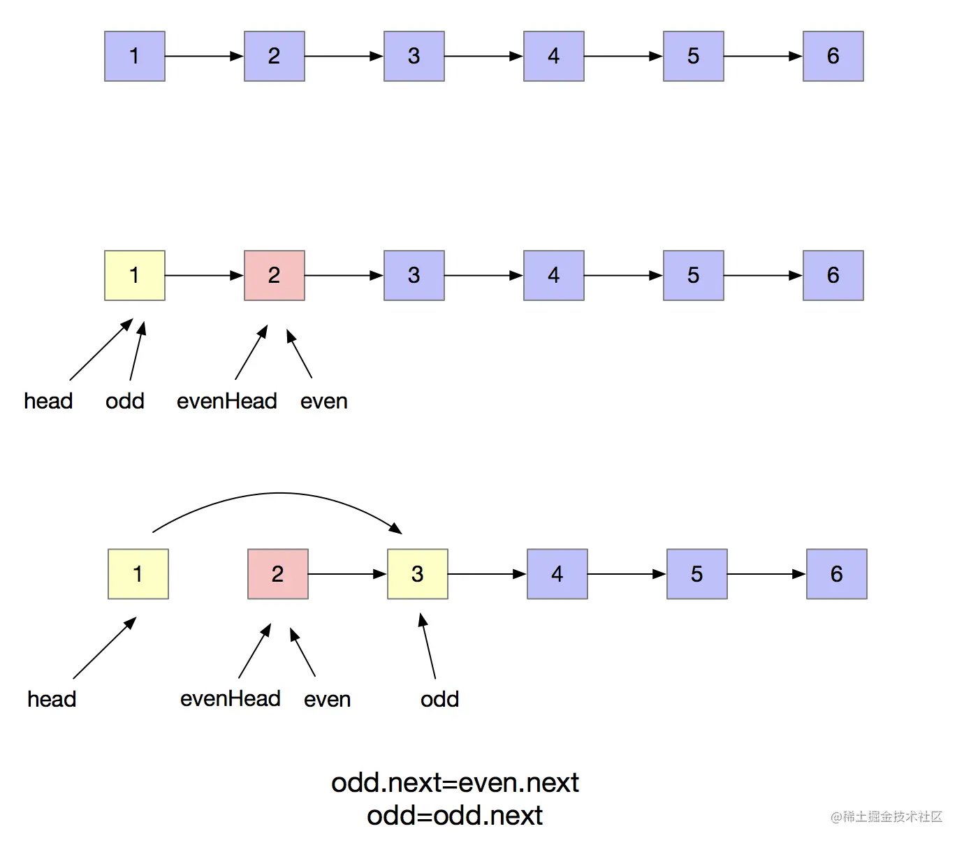 #evenHead指向偶数链表的头节点