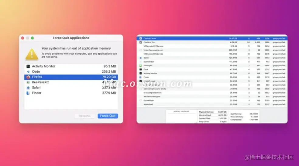 如下图所示,Firefox 火狐浏览器占用了 79.2GB 内存,控制中心占用了超 26GB 内存。目前很难确定哪些型号的 Mac 电脑受到了影响,报告的用户问题较为广泛,包括新发布的 2021 款 14 英寸和 16 英寸 MacBook Pro。