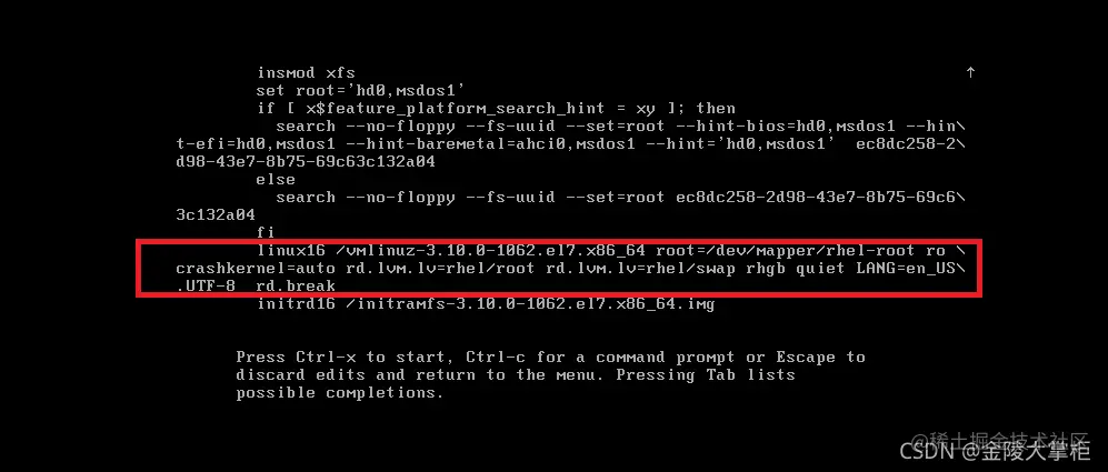 2.进入后,找到linux16开头的地方,按"end"键到最后,输入rd.break,按ctrl+x进入,