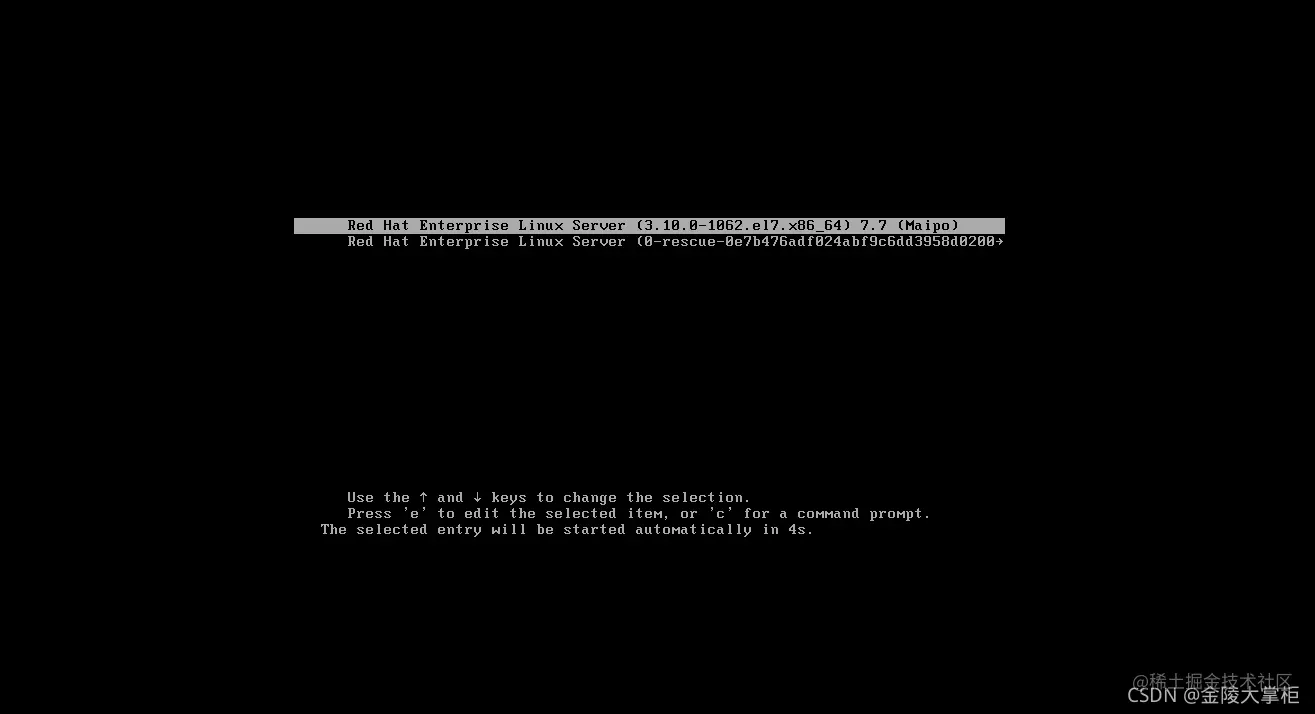 2.1 重启服务器到这一步时按“e”进入内核编辑;