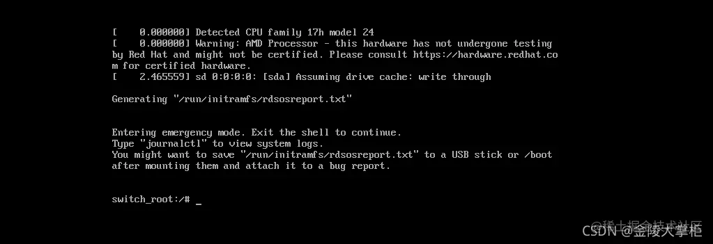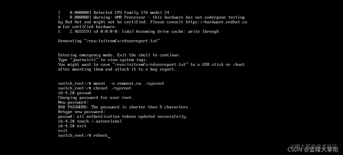 3.进入后输入命令mount,发现根为/sysroot/,并不能写,只有ro=readonly权限.