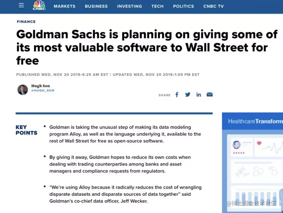 2019 年 11 月份 CNBC 的一则新闻,报道了华尔街巨头高盛要把自己投入了14年研发的一个技术平台Alloy以及专门为这个平台所设计的语言,免费、开源共享给华尔街的其他机构。去年更早的时候,高盛也声称把自己的一些交易与风控相关代码贡献到 GitHub(竞争对手摩根大通则已经把一个与区块链相关的技术 quorum 开源到GitHub)。