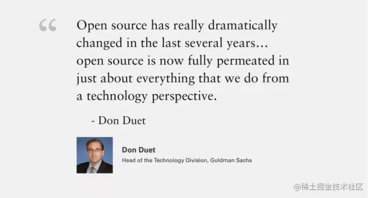 现在谁敢说自己的软件是一行一行代码从零开始构建?正如高盛的技术负责人 Don Duet 所说,从技术角度看“开源渗透到我们所做的一切事情中”。