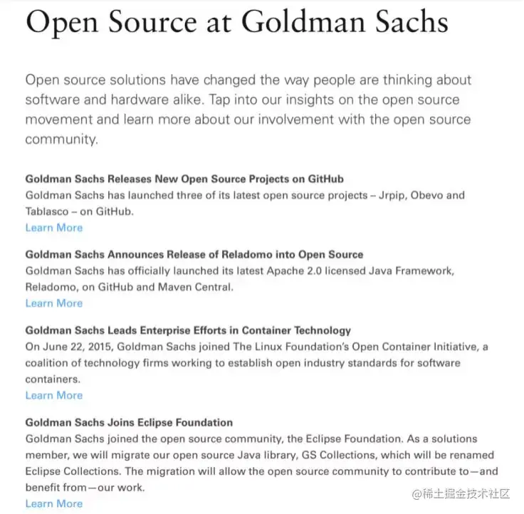 高盛在开源技术这件事情上,貌似是认真的。除了加入开源界出名的开源组织 Eclipse 基金会,2015 年高盛即参与到容器技术企业化的进程中(那还是 docker 这类技术刚刚开始为人知的时候),2017 年起陆续把一些技术开源到 GitHub 上,他们甚至把自己的一个 Java 技术框架采用了 Apache 2.0 的宽松软件许可(一个对开源社区非常友好的许可证)贡献出来。