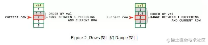ROWS 选择前后几行,例如 ROWS BETWEEN 3 PRECEDING AND 3 FOLLOWING 表示往前 3 行到往后 3 行,一共 7 行数据(或小于 7 行,如果碰到了边界)