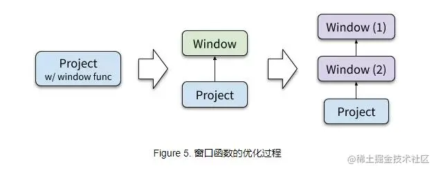 通常,我们首先会把窗口函数从 Project 中抽取出来,成为一个独立的算子称之为 Window。