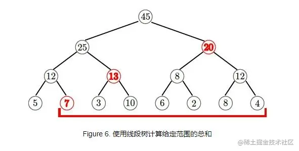 下图是一个使用二叉线段树计算 SUM() 的例子。例如下图中第三行的 1212,表示叶节点 5+75+7 的聚合结果;而它上方的 2525 表示叶节点 5+7+3+105+7+3+10 的聚合结果。