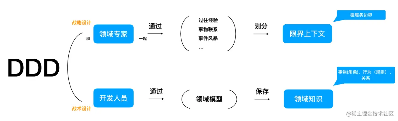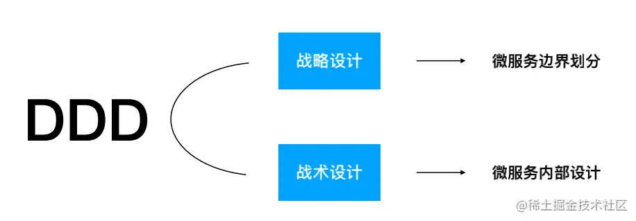DDD主要分为两个部分,战略设计与战术设计,战略设计围绕微服务拆分,战术设计围绕微服务构建